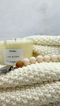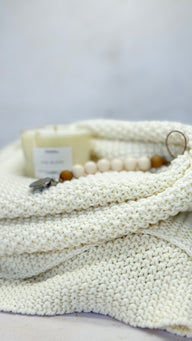 A soft cotton knit blanket paired with a natural soy candle and a silicone bead pacifier chain. Thoughtful, calming, and beautifully gift-ready.